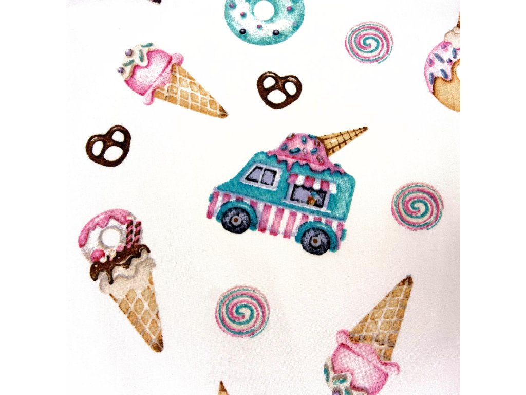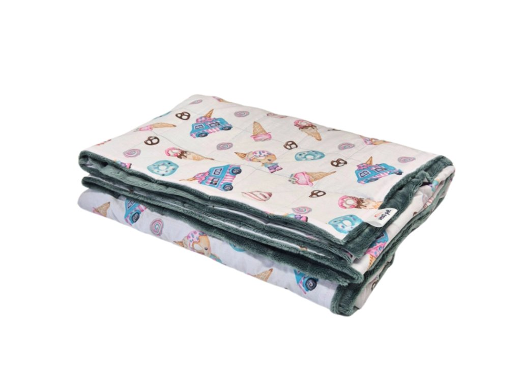 Zátěžová přikrývka z kolekce Fun ze 100% hladké bavlny se vzorem Zmrzlina na jedné straně a měkkého minky nebo hladkého plyše v barvě dle Vašeho výběru na straně druhé (materiály certifikovány dle Oeko -Tex®) - elegantní a příjemné na dotek.